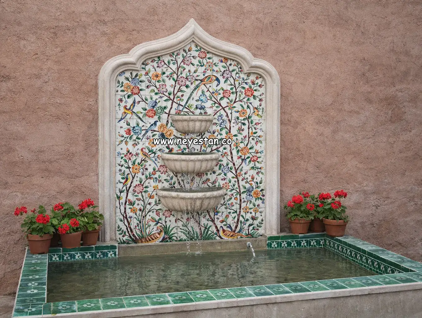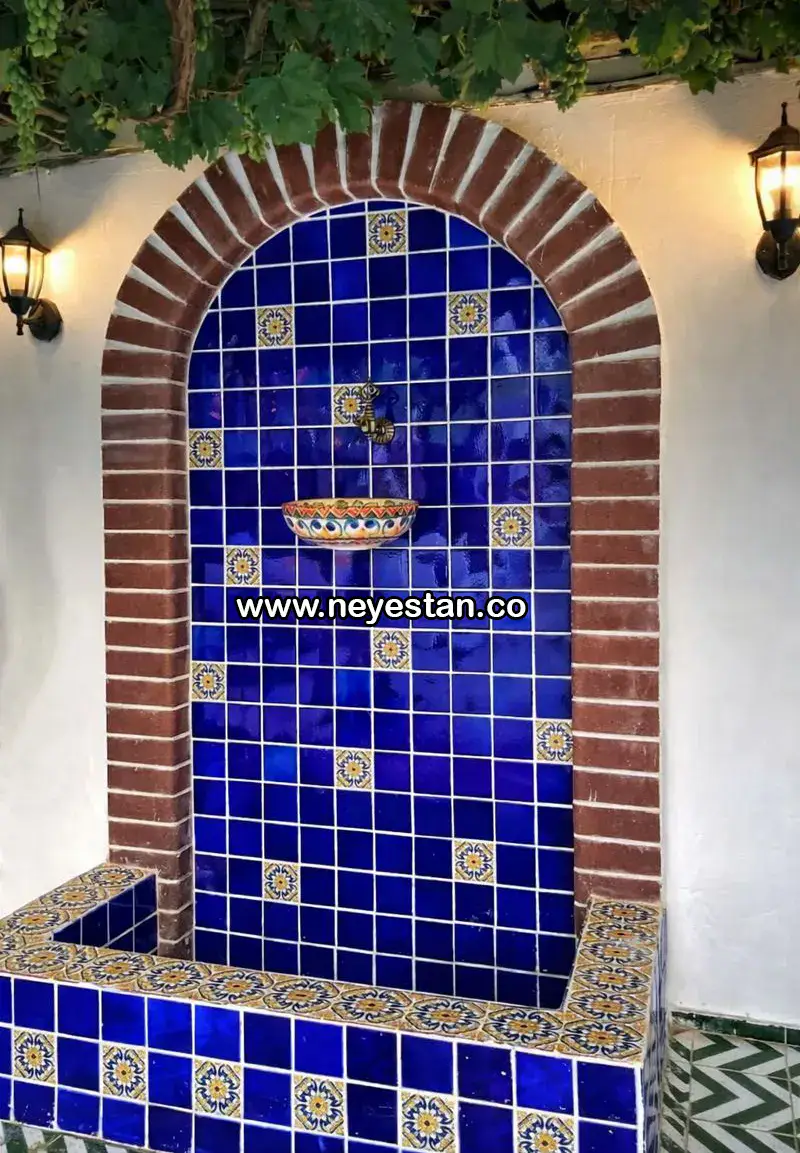 آبنما با کاشی سنتی ایرانی، ساختهشده از کاشیهای دستساز لعابدار؛ تلفیقی از هنر، آب و معماری اصیل.